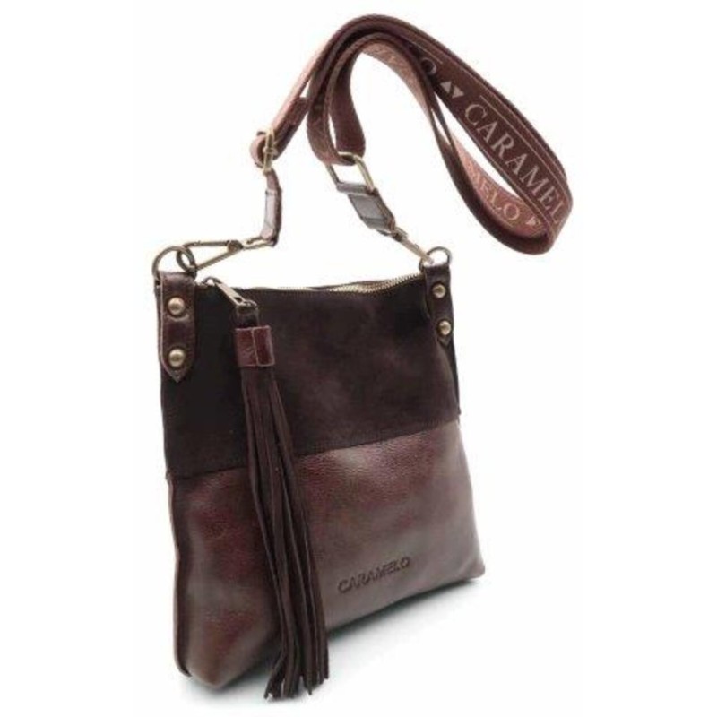 Sac porté travers issu de la marque CARAMELO composé de cuir Marron et de croute de cuir de la même teinte. Ce sac est livré avec une bandoulière en cuir Marron.