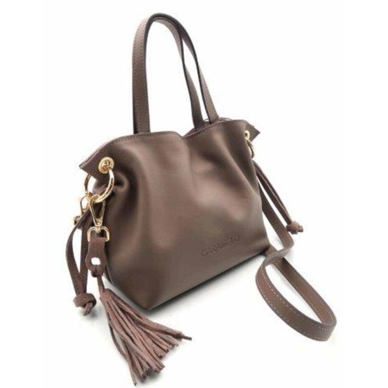 Sac à main issu de la marque CARAMELO composé de cuir Marron et de croute de cuir de la même teinte. Ce sac est livré avec une bandoulière en cuir Marron.