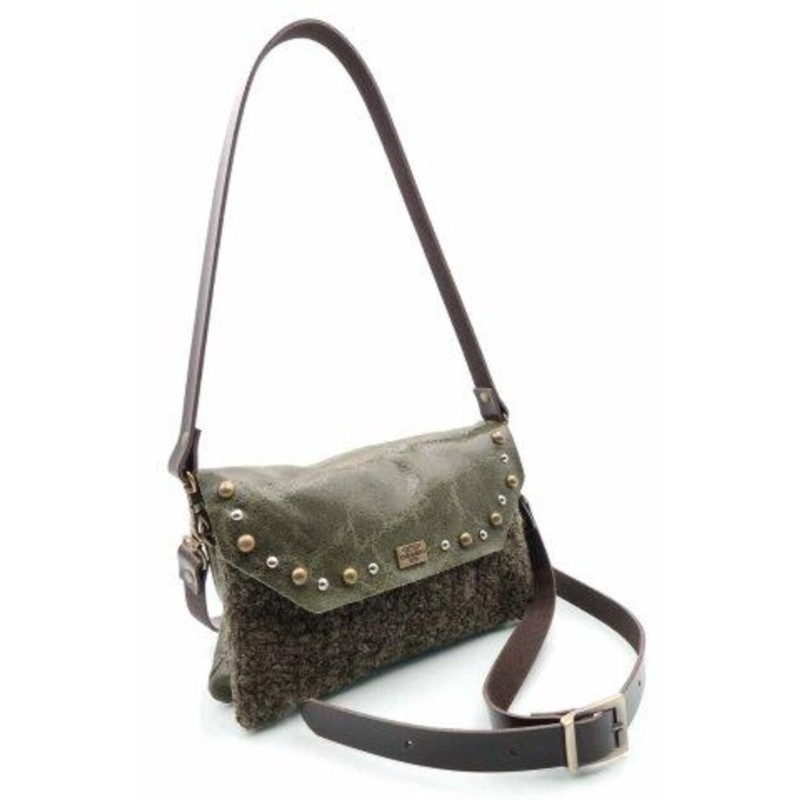Sac porté épaule, issu de la marque CARAMELO composé de Cuir et de Tweed Vert. Ce sac est livré avec une bandoulière réglable verte.