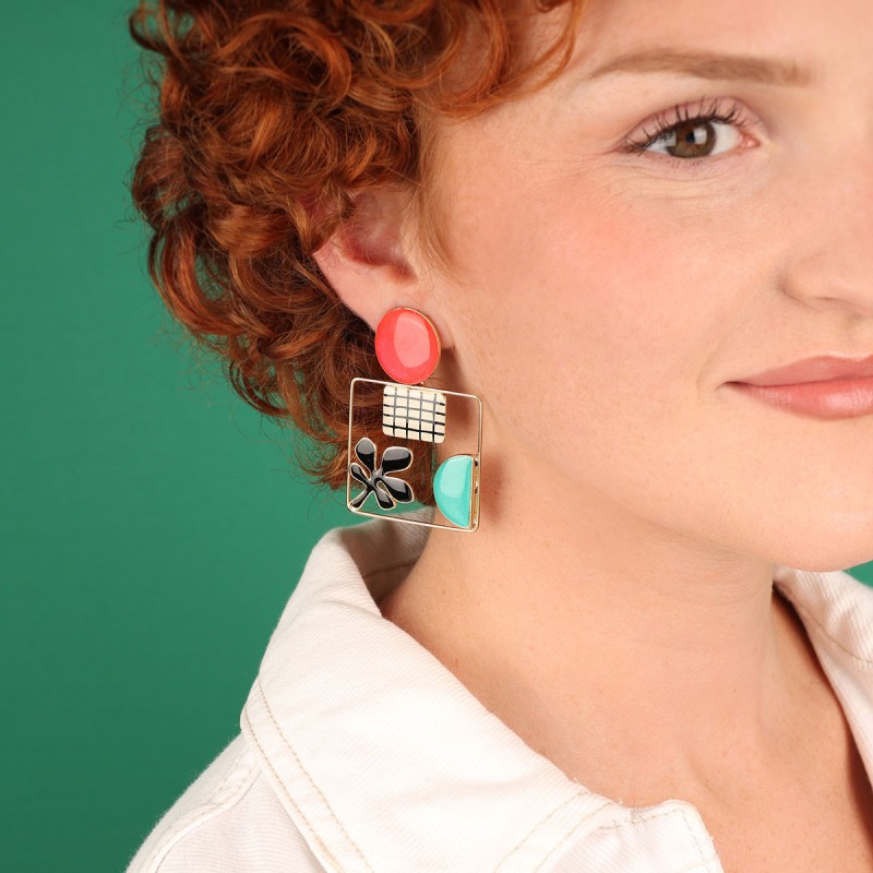 Composition : Etain, Résines colorées dont les motifs sont peints à la main, Résine transparente, Poudre de mica, Laiton doré à l’or fin sans nickel et traité contre les allergies.