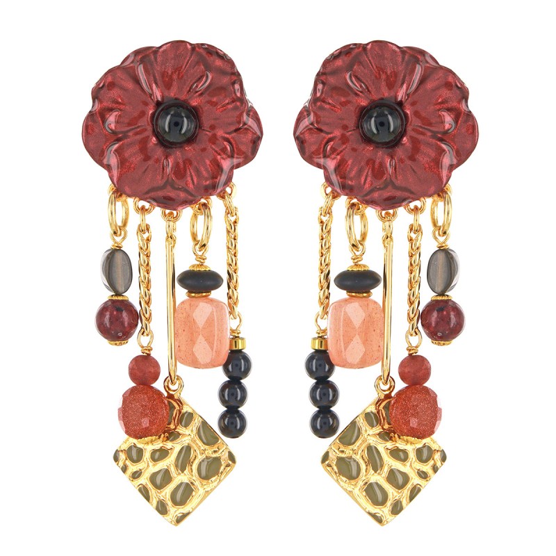 Composition : Étain, Résines colorées dont les motifs sont peints à la main, Résine transparente, Poudre de mica, Hématite dorée, Pierre de soleil, Gold sandstone, Onyx, Agate teintée, Laiton sans nickel et traité contre les allergies.