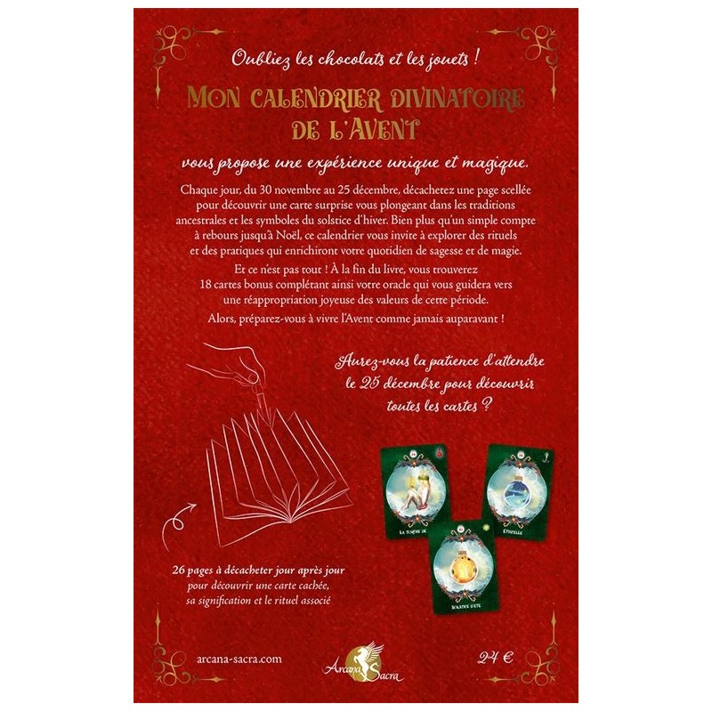 Oubliez les chocolats et les jouets ! Mon calendrier divinatoire de l’Avent vous propose une expérience unique et magique. Chaque jour, du 30 novembre au 25 décembre, décachetez une page scellée pour découvrir une carte surprise vous plongeant dans les traditions ancestrales et les symboles du solstice d'hiver. Bien plus qu'un simple compte à rebours jusqu'à Noël, ce calendrier vous invite à explorer des rituels et des pratiques qui enrichiront votre quotidien de sagesse et de magie. Et ce n'est pas tout ! À la fin du livre, vous trouverez 18 cartes bonus complétant ainsi votre oracle qui vous guidera vers une réappropriation joyeuse des valeurs de cette période. Alors, préparez-vous à vivre l'Avent comme jamais auparavant ! De Camille Serres et Stéphanie Gras.