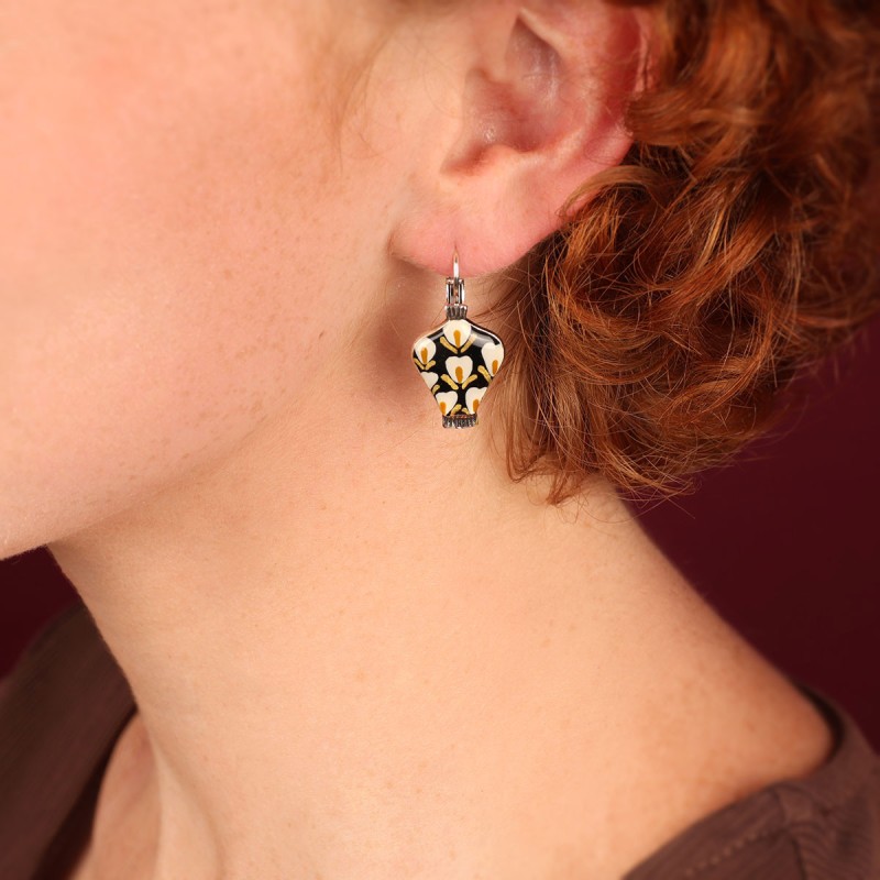 Composition : Étain, Résines colorées dont les motifs sont peints à la main, Peinture dorée, Laiton sans nickel et traité contre les allergies.