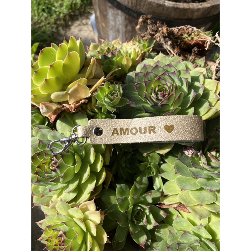 Porte-Clés en cuir Métallisé Or issu de la marque LA CARTABLIERE sur lequel est imprimé Amour.