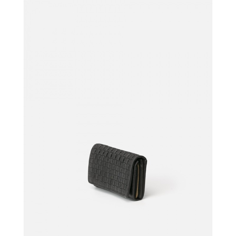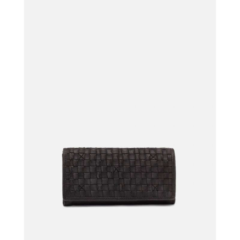 Portefeuille Kansas en cuir tressé Noir issu de la marque BIBA. Fermeture à rabat avec bouton, compartiments pour cartes, billets et pièces. Ce portefeuille Kansas appartient à la ligne Héritage de chez BIBA.