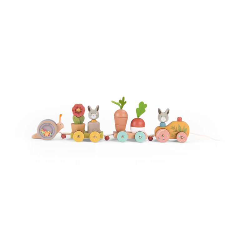 Jouet d’éveil 2 en 1, à la fois empilable et jouet à tirer. Ce train d’activités en bois comprend 1 locomotive et 3 wagons détachables sur lesquels les tout petits pourront reconstituer la carotte, la fleur, ou faire rouler l’escargot