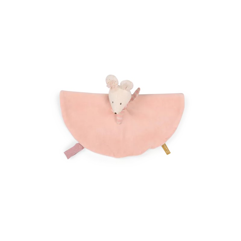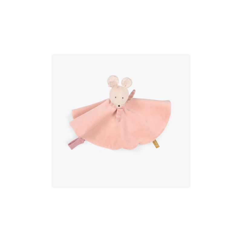 Doudou souris au doux visage brodé pour accompagner bébé. En éponge velours rose poudré et crème avec attache-tétine. Plat et rond, il est facile à saisir par les petits mains.