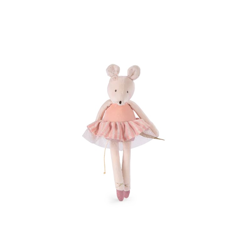 Petite souris en velours au doux visage brodé ! Joues poudrées, jupe tutu rayée rose, petit nœud sur la tête et ballerines nouées, elle est d’une grande élégance. Facile à attraper par les petites mains, elle deviendra le compagnon privilégié de bébé.