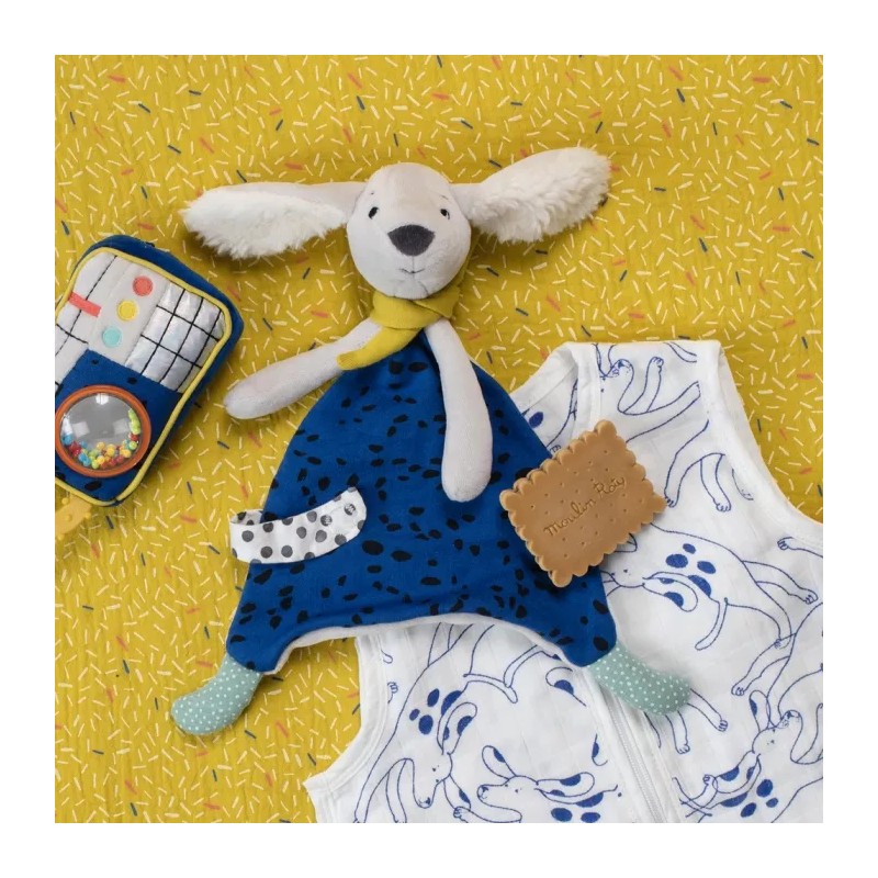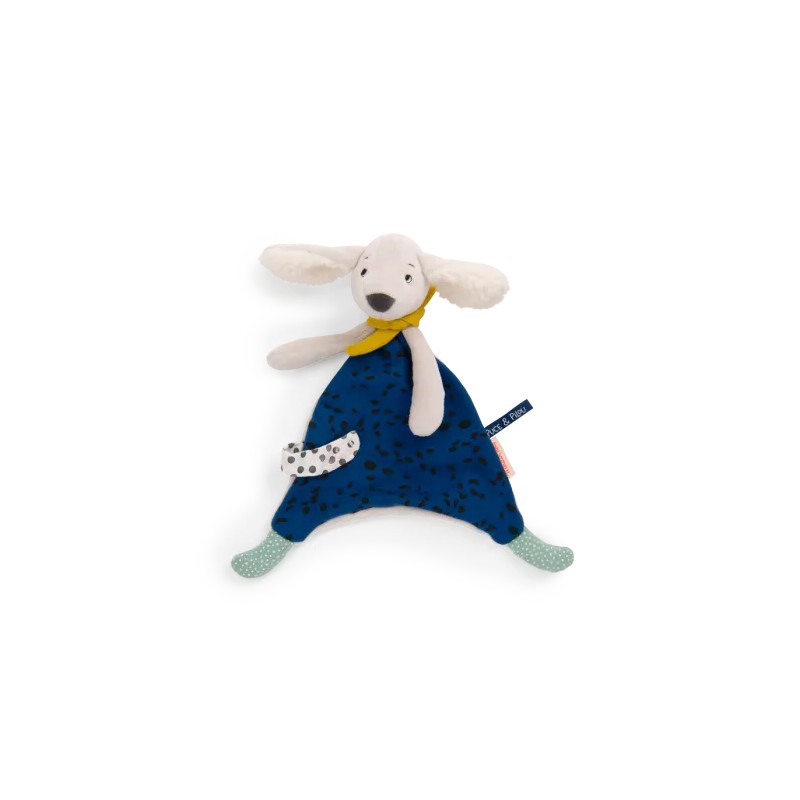 Doudou chien plat avec attache-tétine. Avec ses grandes oreilles toutes douces et ses grands bras, il est facile à saisir par les petites mains. Il deviendra vite un indispensable pour accompagner bébé dans toutes ses aventures et ses moments de tendresse.
