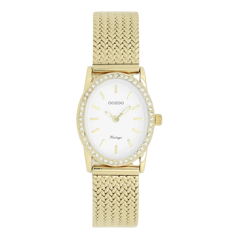 Montre femme Ovale signée OOZOO. Cette montre pour femme allie parfaitement mode et confort grâce à son boîtier en métal doré de 28 x 23 mm orné de cristaux et son cadran blanc soleillé. Son bracelet en Mesh couleur dorée en fait un accessoire tendance à porter au quotidien. Le cadran arbore des chiffres et des aiguilles dorés rayés. Un modèle qui apporte une touche d'éclat à votre tenue.