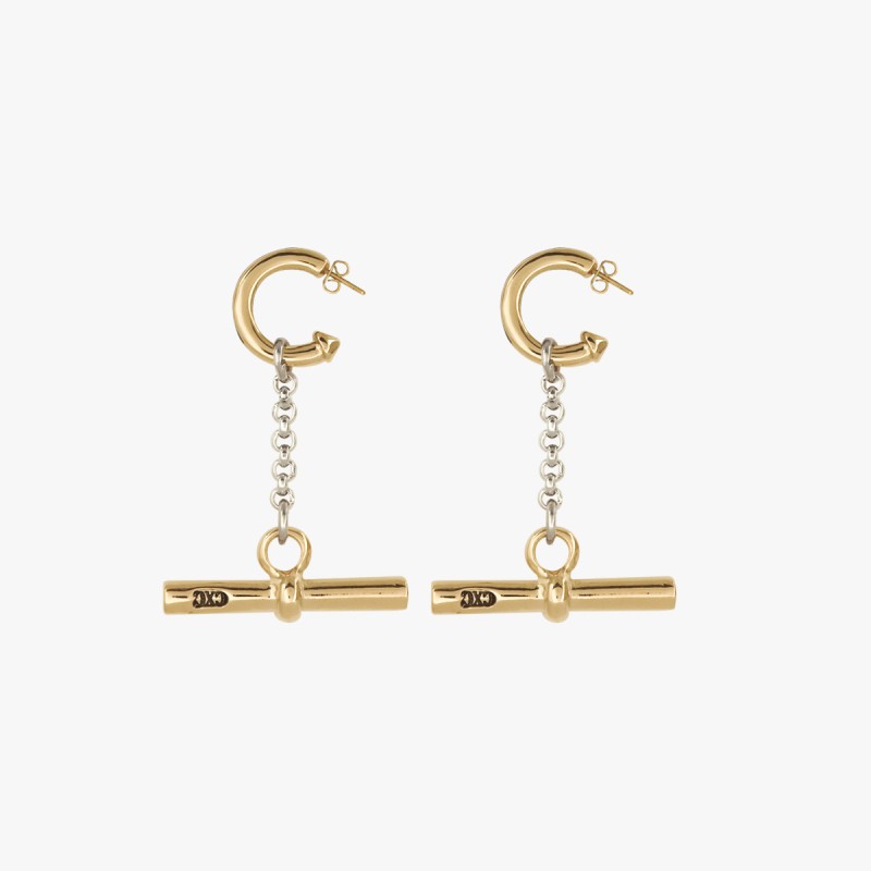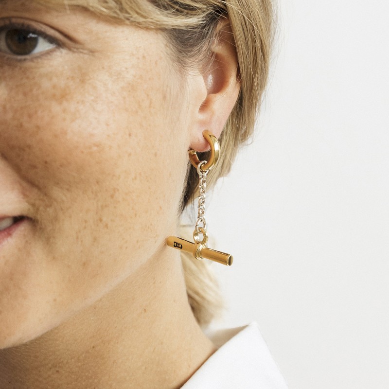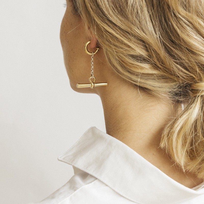 Boucles d'oreilles créoles signées CXC ornées d’une barrette de 3.3 cm sur chaine. Les créoles sont indépendantes, elles peuvent se porter seules.
