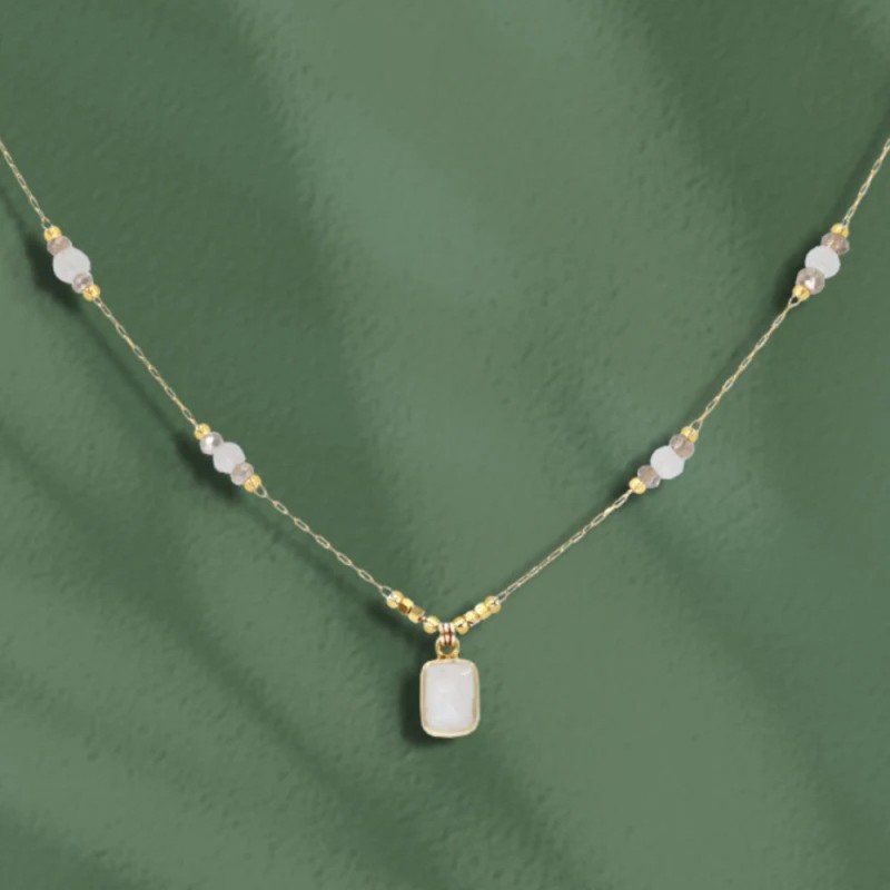 Collier Chiara Lune signé Loetma orné d’un petit pendentif rectangulaire en pierre de Lune, accompagné d'un enfilage de perles assortis.