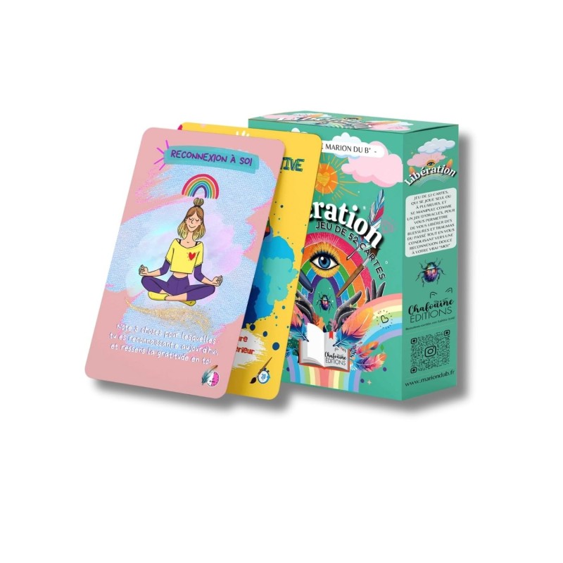 Plongez dans un voyage introspectif et artistique avec Libération, un jeu de 52 exercices d’écriture dédiés à la libération émotionnelle. Organisé autour de cinq thèmes puissants ― reconnexion à soi, lâcher prise, éclat de plume, blessures du passé et expression créative ―, ce jeu vous offre un espace pour exprimer vos émotions et explorer votre monde intérieur. Pensé pour accompagner vos moments de calme et de soin de soi, Libération devient rapidement l’allié idéal de vos soirées cocooning, offrant une parenthèse bienveillante pour vous recentrer. Une création de Marion Du B’, auteure de la saga « La Thérapie par le Rire ».