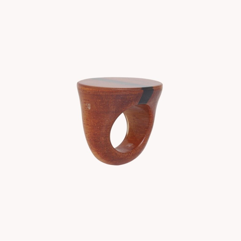 Bague ronde Cannelle signée NATURE bijoux. Les bijoux Cannelle associent le bois de Bayong sélectionné pour ses veinages ambrés à la corne noire polie, soulignés de laiton doré. Chaque pièce est façonnée à la main dans nos ateliers ; de légères variations de teinte et de veinage attestent l’authenticité des matières naturelles.. C’est une collection de bijoux en matières naturelles qui assume le contraste, l’équilibre et la tenue, fidèle à l’exigence Nature Bijoux.