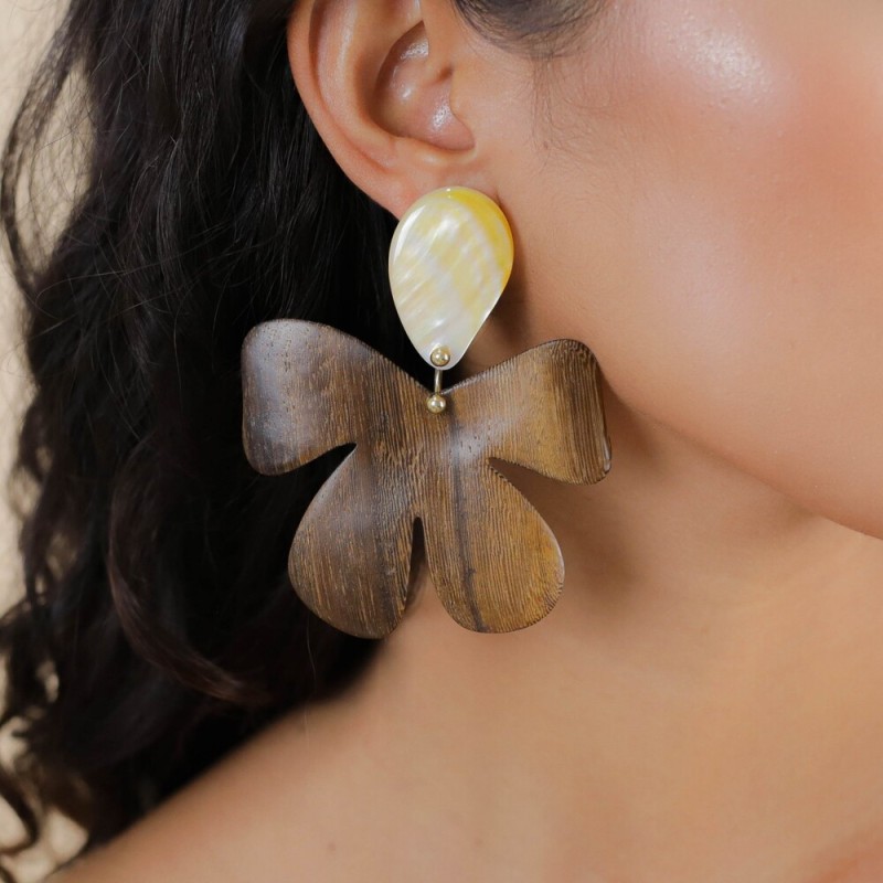 Fioria naît d’un face-à-face entre deux matières nobles. Le bois de Roblès, dense et graphique, sculpte des pétales précis. La nacre dorée diffuse une lumière douce et régulière. Ensemble, elles dessinent une fleur stylisée, plus proche d’un motif couture que d’un jardin. Les formes sont franches, le rendu spectaculaire, et pourtant le porté reste étonnamment léger grâce au travail fin des artisans. Des bijoux en matières naturelles qui posent une signature nette et contemporaine.