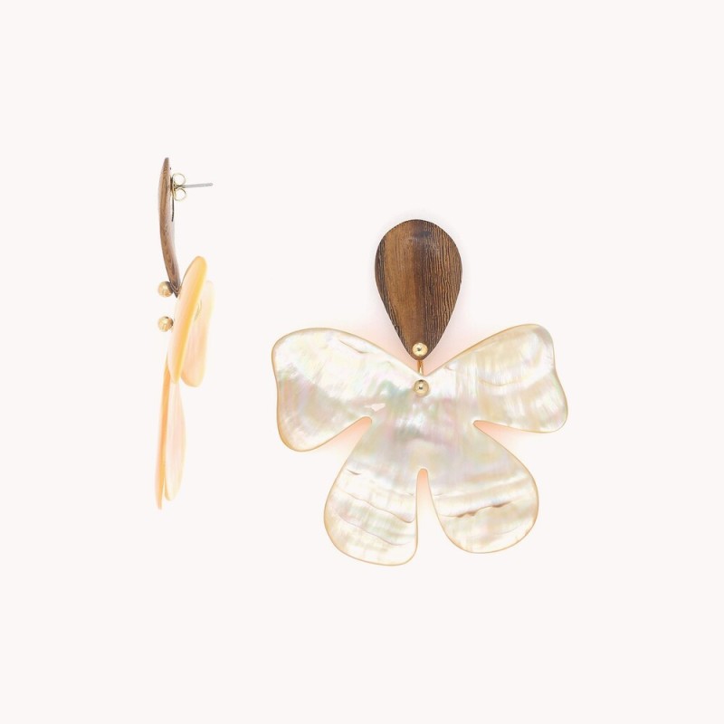Fioria naît d’un face-à-face entre deux matières nobles. Le bois de Roblès, dense et graphique, sculpte des pétales précis. La nacre dorée diffuse une lumière douce et régulière. Ensemble, elles dessinent une fleur stylisée, plus proche d’un motif couture que d’un jardin. Les formes sont franches, le rendu spectaculaire, et pourtant le porté reste étonnamment léger grâce au travail fin des artisans. Des bijoux en matières naturelles qui posent une signature nette et contemporaine.