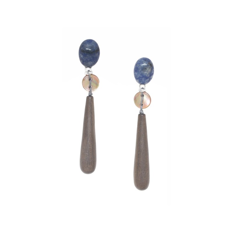 Composition : Ebène gris, Nacre brune, Sodalite, Laiton sans nickel traité contre les allergies.