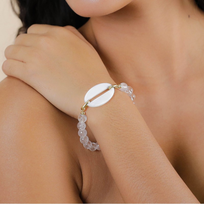Bracelet Extensible Nacre blanche & Cristal de Roche.