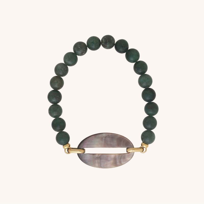 Bracelet Extensible Ellipse signé NATURE bijou composé de Nacre noire et d’Aventurine.