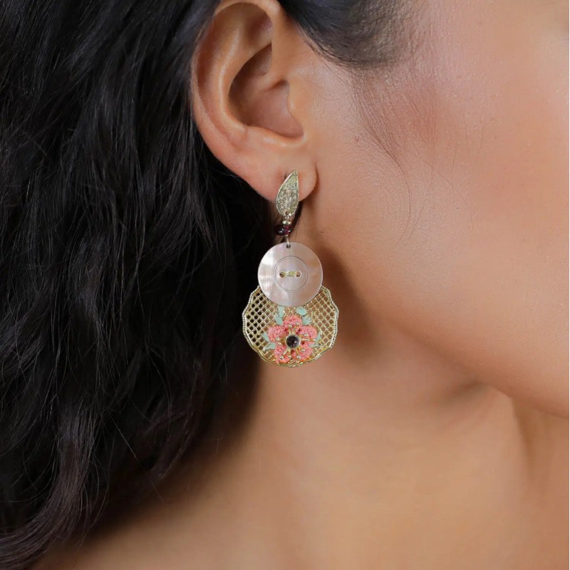 Bridget met la broderie au centre de cette nouvelle collection. Sur un motif doré ultra-léger, la fleur en fil de coton explose en rose poudré, réveillée par des touches d’amazonite, d’aventurine et de grenat. Les boucles d’oreilles fleur brodée ce sont clairement ta signature : volume maîtrisé, mouvement cool, zéro lourdeur, c'est la paire qu’on remarque.