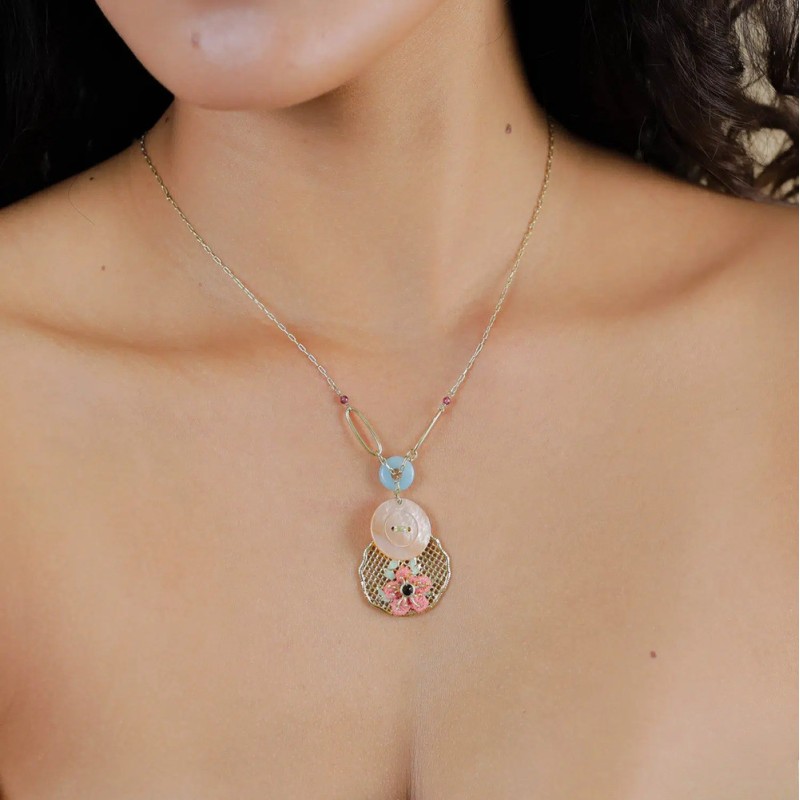 Collier long Bridget signé FRANCK HERVAL. Bridget met la broderie au centre de cette nouvelle collection. Sur un motif doré ultra-léger, la fleur en fil de coton explose en rose poudré, réveillée par des touches d’amazonite, d’aventurine et de grenat. Les boucles d’oreilles fleur brodée ce sont clairement ta signature : volume maîtrisé, mouvement cool, zéro lourdeur, c'est la paire qu’on remarque.