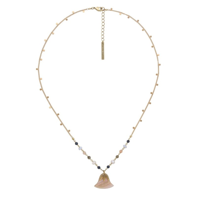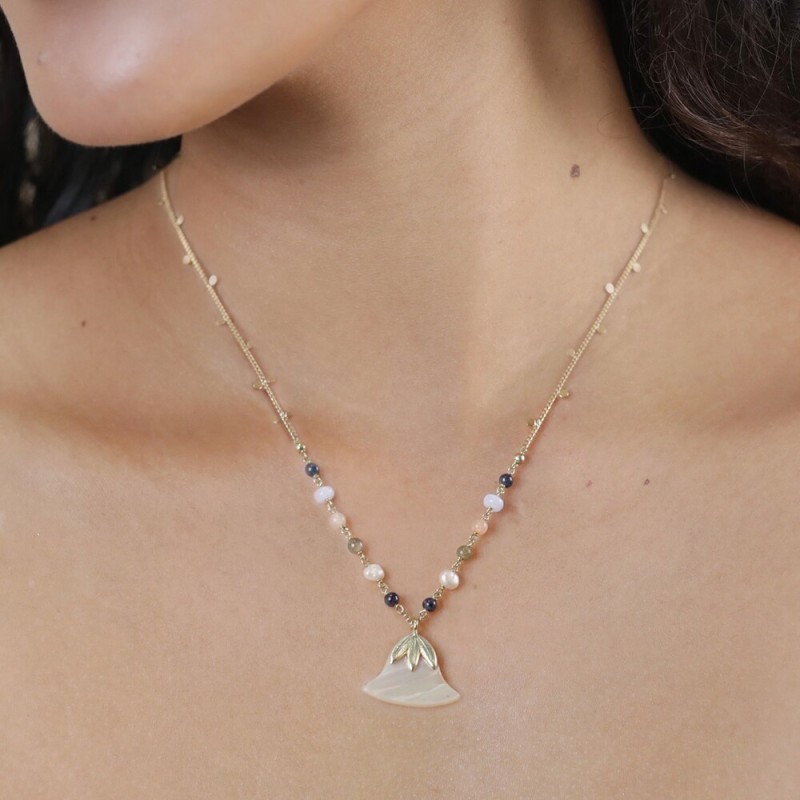 Composition : Rose ormeau, Calcédoine bleue, Lapis-lazuli, Perles de culture, Pierre de lune, Laiton doré à l’or 18K sans nickel et traité contre les allergies.