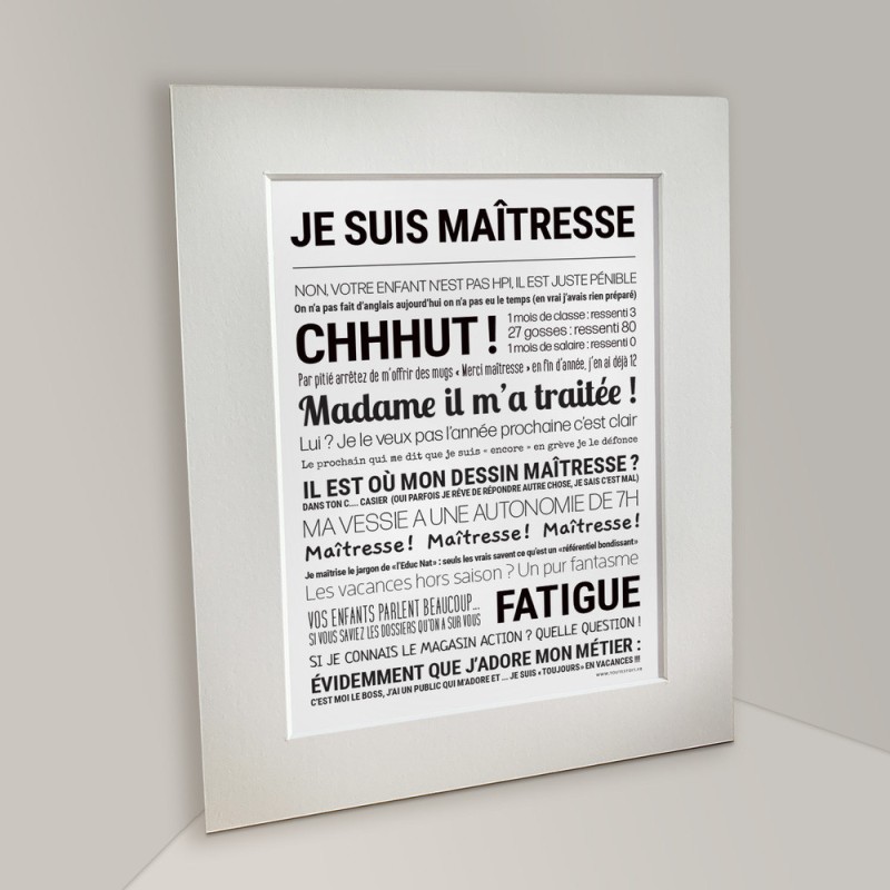 Affiche Je Suis Maitresse signée TOUT EST DIT livrée avec un passe-partout, elle est prête à être encadrée.