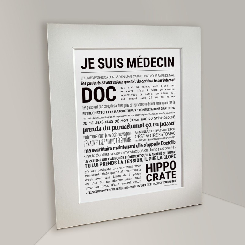 Affiche Je Suis Médecin signée TOUT EST DIT livrée avec un passe-partout, elle est prête à être encadrée.