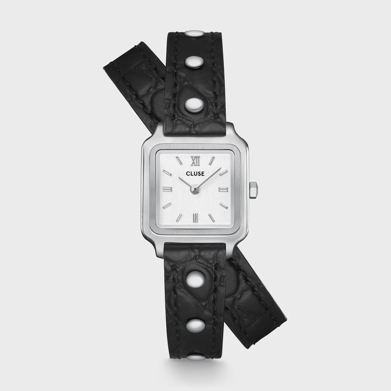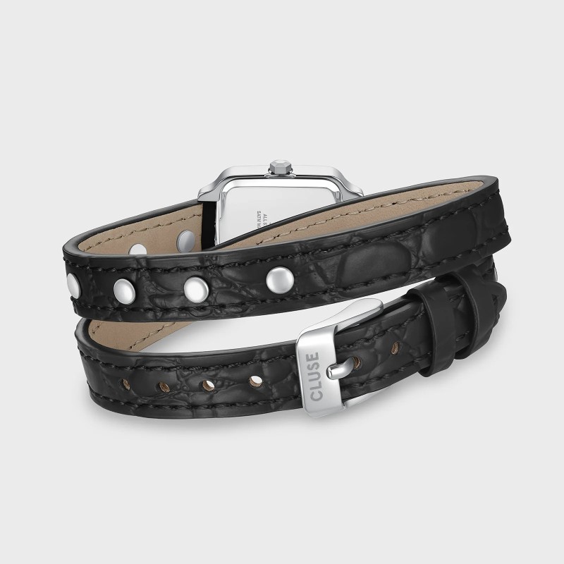 Montre Carrée Gracieuse Mini pour femme signée CLUSE. La montre carrée Gracieuse Mini pour femme est dotée d'un boîtier argenté de 21mm, d'un cadran brossé argenté et d'un double bracelet en cuir noir de 12mm avec des clous argentés.
