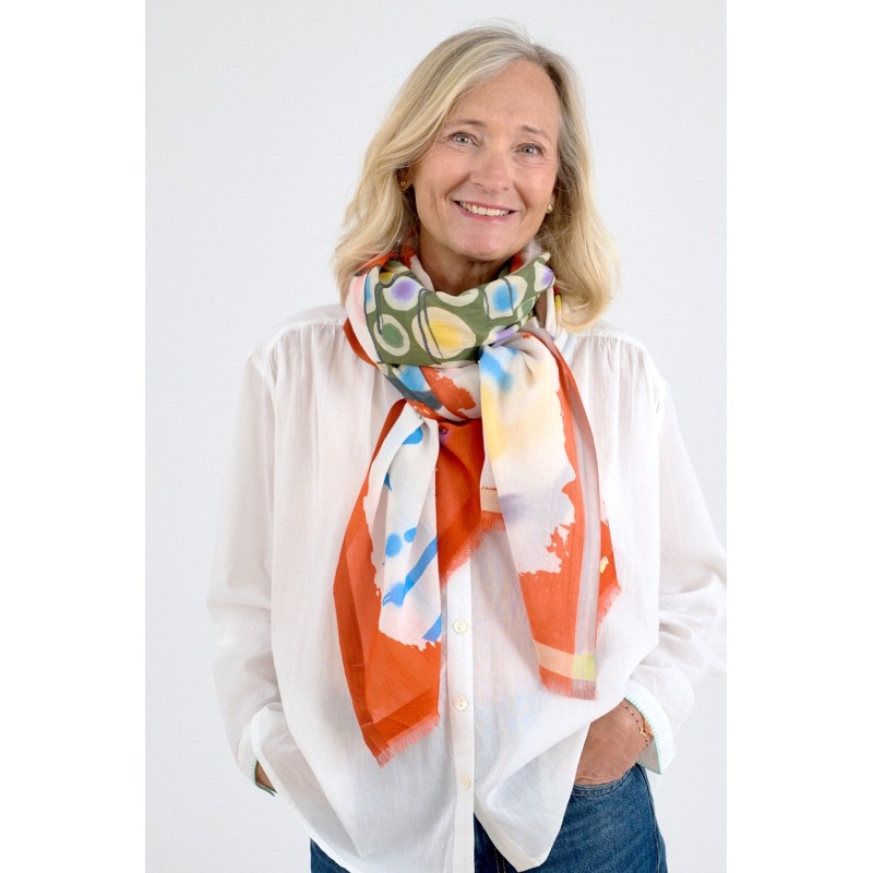 Foulards conçus en France dans l'atelier de Marie Gozard et produits en Inde par des artisans locaux sélectionnés pour leur savoir faire et pour leur respect des normes ethniques et environnementales. Ce foulard a été conçu en respectant les méthodes traditionnelles de teinture et d’impression Indienne. Les variations de couleur et d’impression ne sont pas des défauts, mais plutôt des éléments qui contribuent à la beauté naturelle et à la singularité de chaque écharpe.