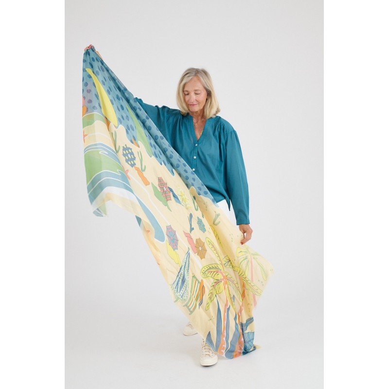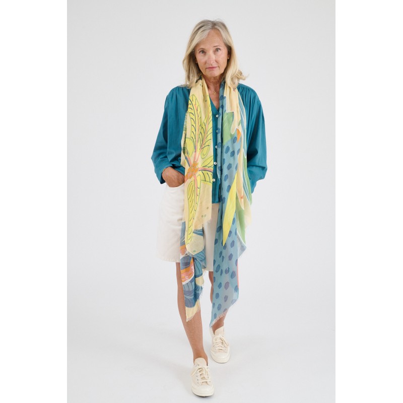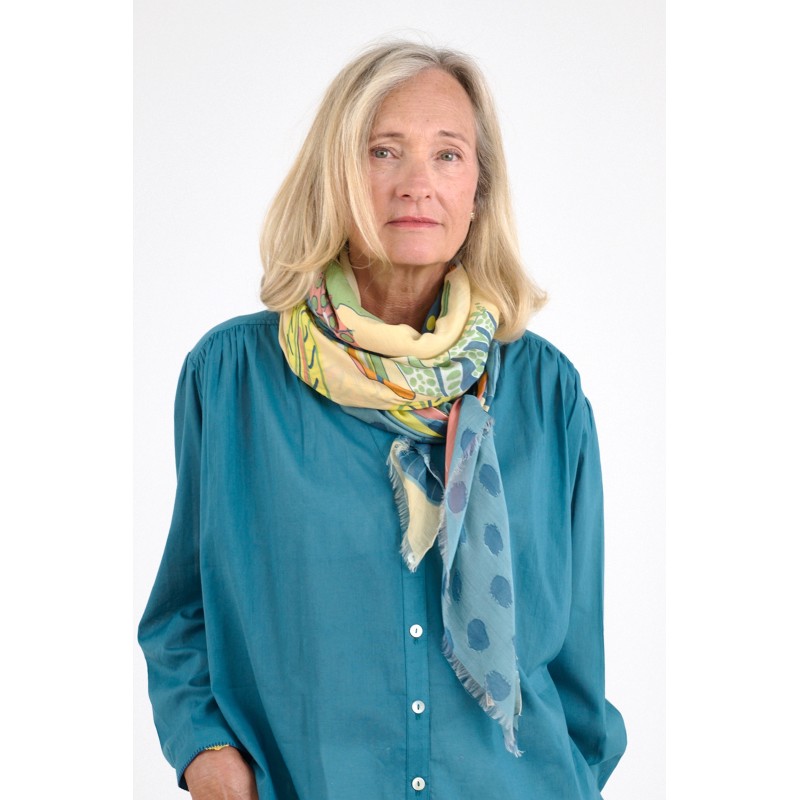 Foulards conçus en France dans l'atelier de Marie Gozard et produits en Inde par des artisans locaux sélectionnés pour leur savoir faire et pour leur respect des normes ethniques et environnementales. Ce foulard a été conçu en respectant les méthodes traditionnelles de teinture et d’impression Indienne. Les variations de couleur et d’impression ne sont pas des défauts, mais plutôt des éléments qui contribuent à la beauté naturelle et à la singularité de chaque écharpe.