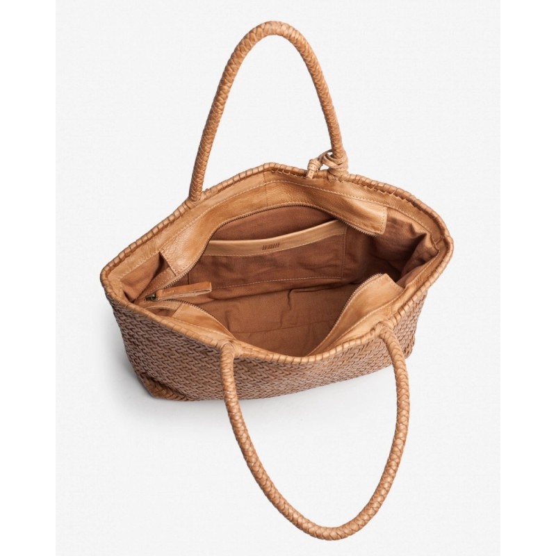 Sac Cabas Perkins en cuir Camel issu de la marque BIBA en cuir de vachette tressé. Fermeture zippée. Poches intérieures. Doublure en coton. Extérieures, et doublure en coton..