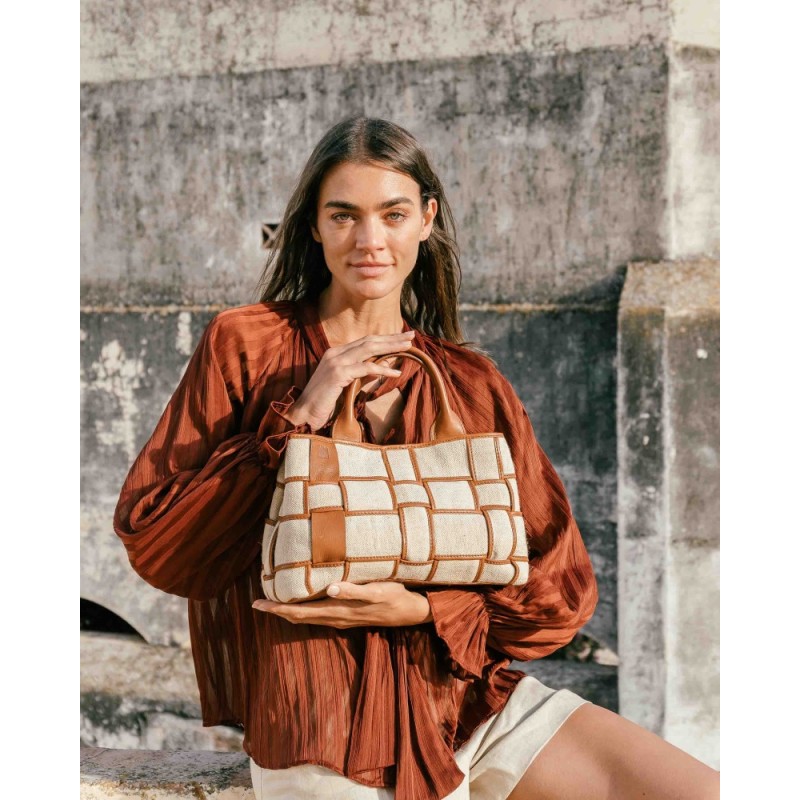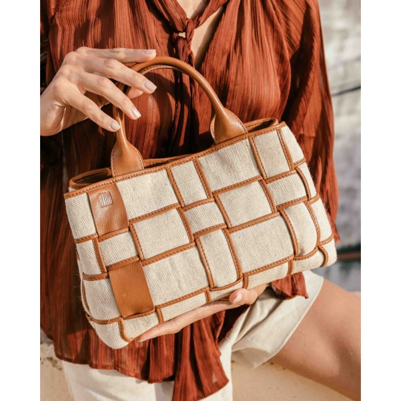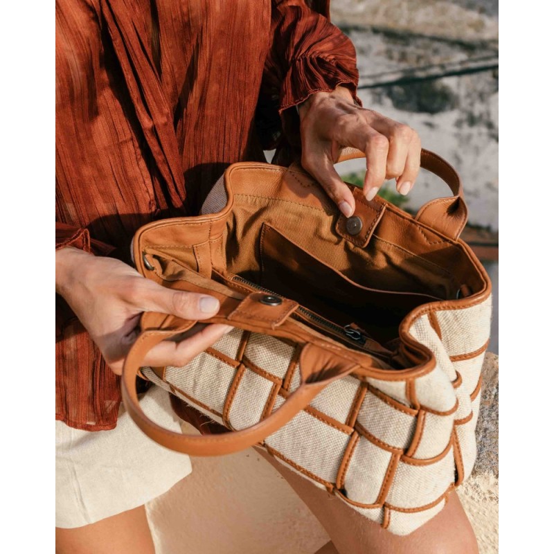 Sac Wann en cuir Tan & Lin issu de la marque BIBA. Sac bowling en cuir de vachette lavé et lin. Poignées supérieures. Fermeture à bouton. Bandoulière ajustable et amovible. Deux compartiments intérieurs. Multiples poches intérieures. Doublure en coton.