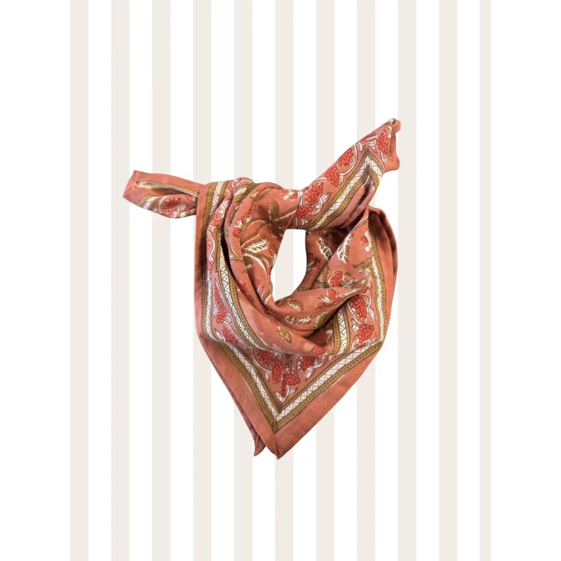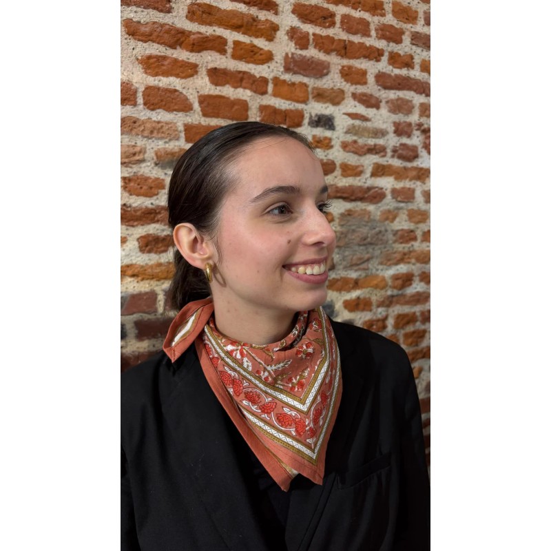 Chaque foulard est imprimé artisanalement à Jaipur avec la technique traditionnelle du block print. Les motifs sont appliqués à la main, ce qui rend chaque pièce unique. De petites variations de couleurs peuvent apparaître, et c’est ce qui fait tout leur charme.