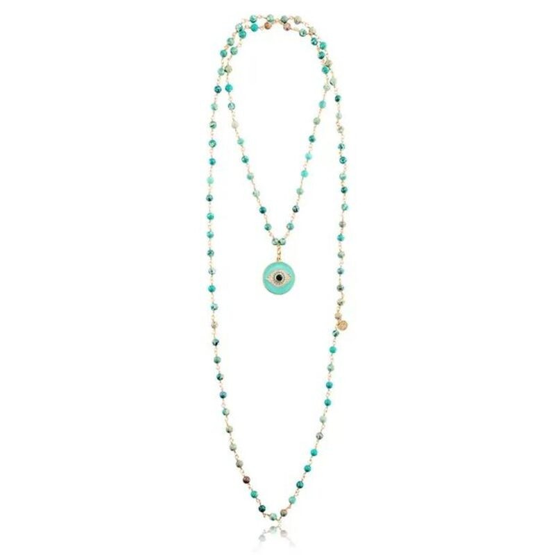 Collier Sautoir 2 rangs Aqua signé MADAMIRMA orné d’une médaille émaillée.