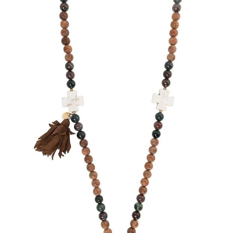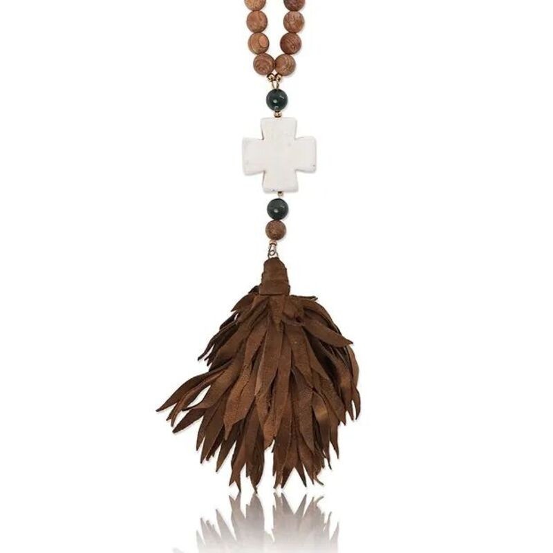 Collier Karma signé MADAMIRMA composé de perles de 10mm et orné d’un pompon en cuir fait main.