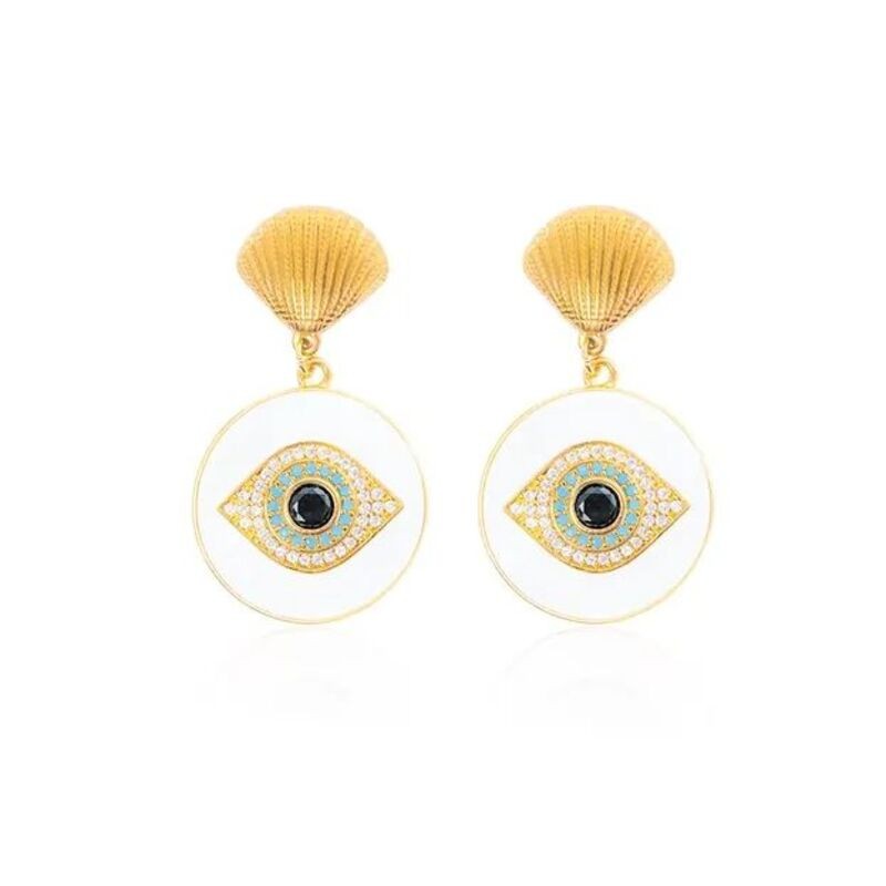 Boucles d'oreilles Poussoir Gaya signées MADAMIRMA ornées d’une médaille émaillée rehaussée de Zirconium.