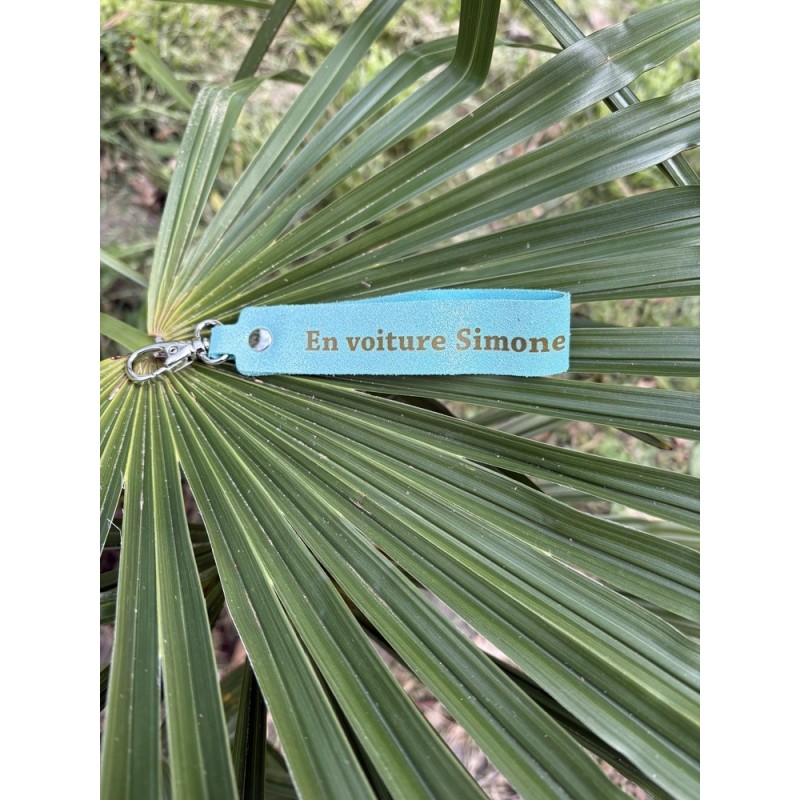 Porte-Clés en Cuir Pailleté Menthe issu de la marque LA CARTABLIERE sur lequel est imprimé En Voiture Simone.
