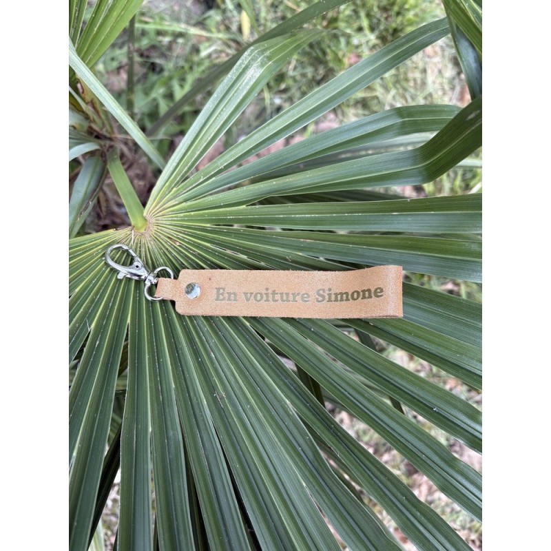 Porte-Clés en Cuir Pailleté Sable doré issu de la marque LA CARTABLIERE sur lequel est imprimé En Voiture Simone.