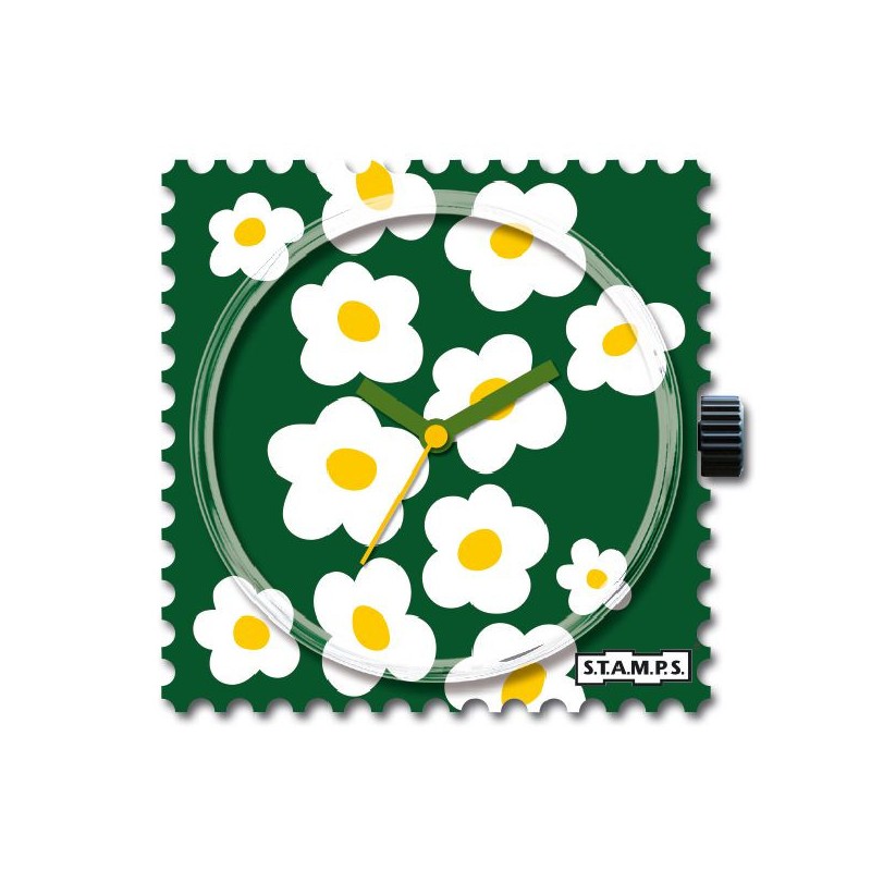 Découvrez la montre STAMPS "Daisys Dream" avec son motif floral moderne et illustré sur un fond vert vibrant, cette montre vous apporte le printemps.