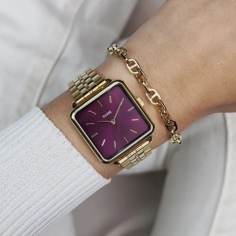 Montre Femme Tetragone Dark Cherry signée CLUSE. Dotée d’un boîtier carré de 28,5 mm de couleur or, d’un cadran couleur cerise foncée et d’un bracelet en acier inoxydable de 1.6 cm. Vous pouvez facilement ajuster vous-même la taille du bracelet de montre.