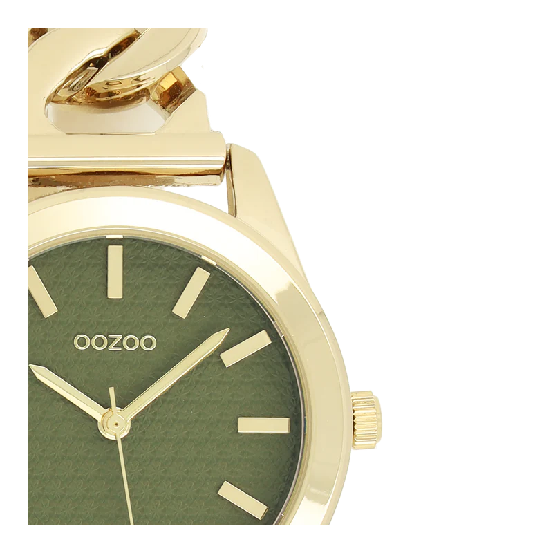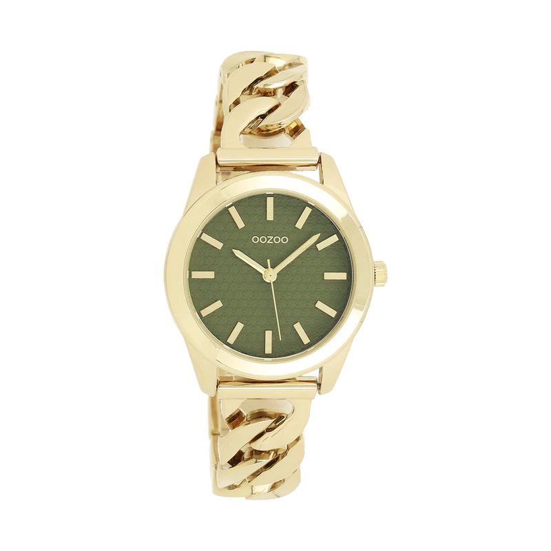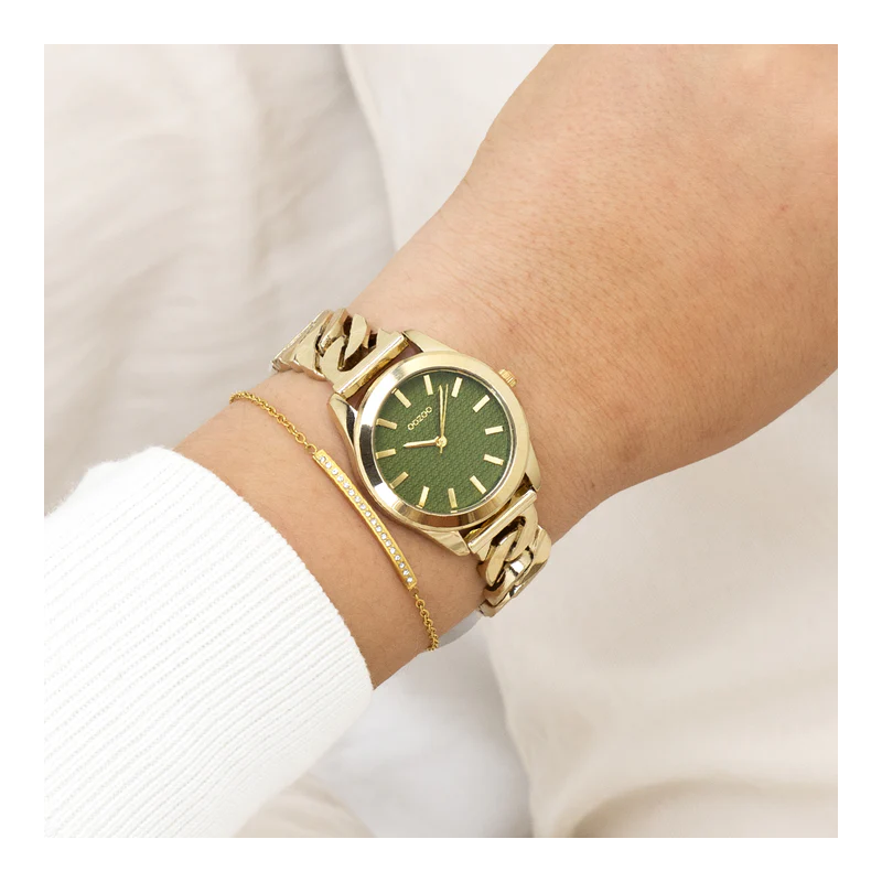 Montre femme ronde signée OOZOO. Distinguez-vous avec ce magnifique modèle femmes rond de la collection tendance OOZOO Timepieces. Cette nouvelle montre est rehaussée d’un bracelet à petite chaîne couleur or et d’un boîtier tendance métal couleur or de 32 mm de diamètre. Faites sensation avec ce cadran vert foncé motif et un index couleur or rayures et des aiguilles assorti. Cette montre est un incontournable de votre garde-robe et possède un verre minéral, une plaque arrière en acier inoxydable et est sans danger pour le nickel.