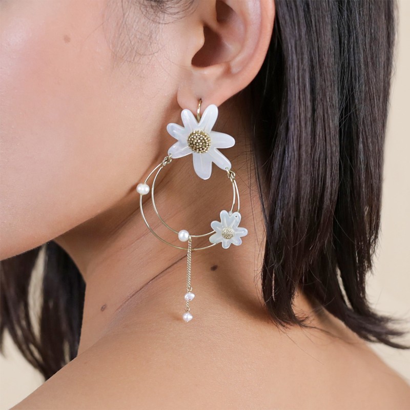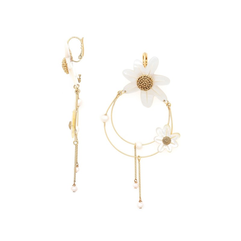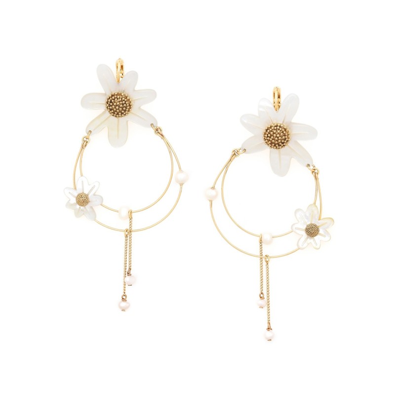 Taillées directement dans la nacre blanche et sublimées par un cabochon doré, ces marguerites éclatantes s’invitent sur des boucles XXL, des bagues pleines de fraîcheur ou encore des colliers minimalistes.