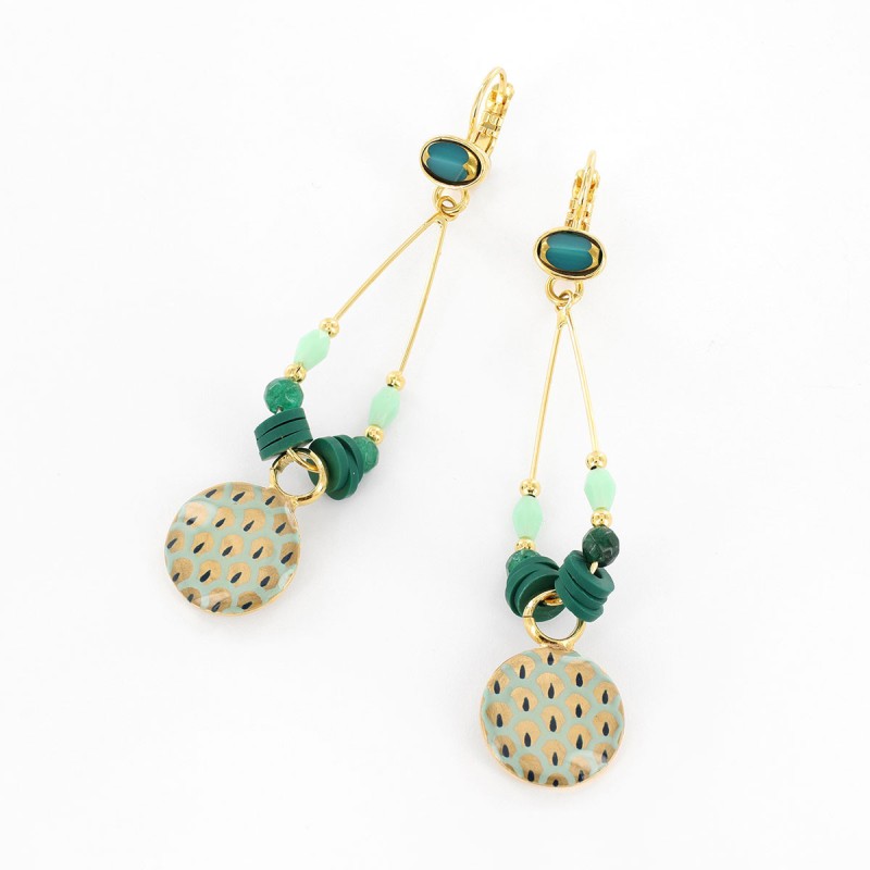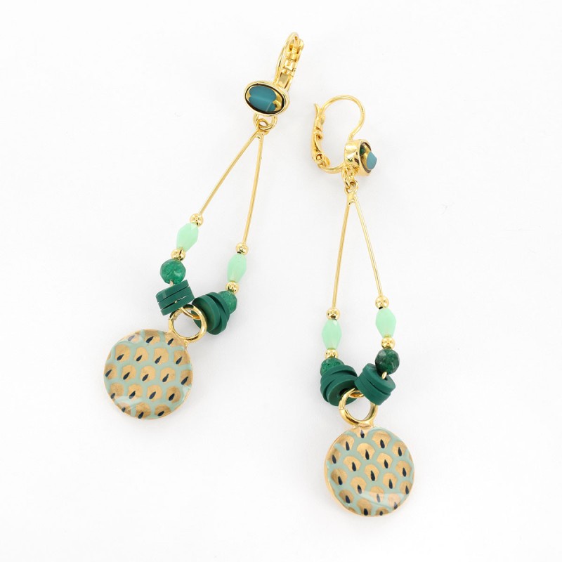 Composition : Résines colorées dont les motifs sont peints à la main, Perles en verre, Peinture dorée, Agate teintée, Perles Heishi, Métal sans nickel et traité contre les allergies.