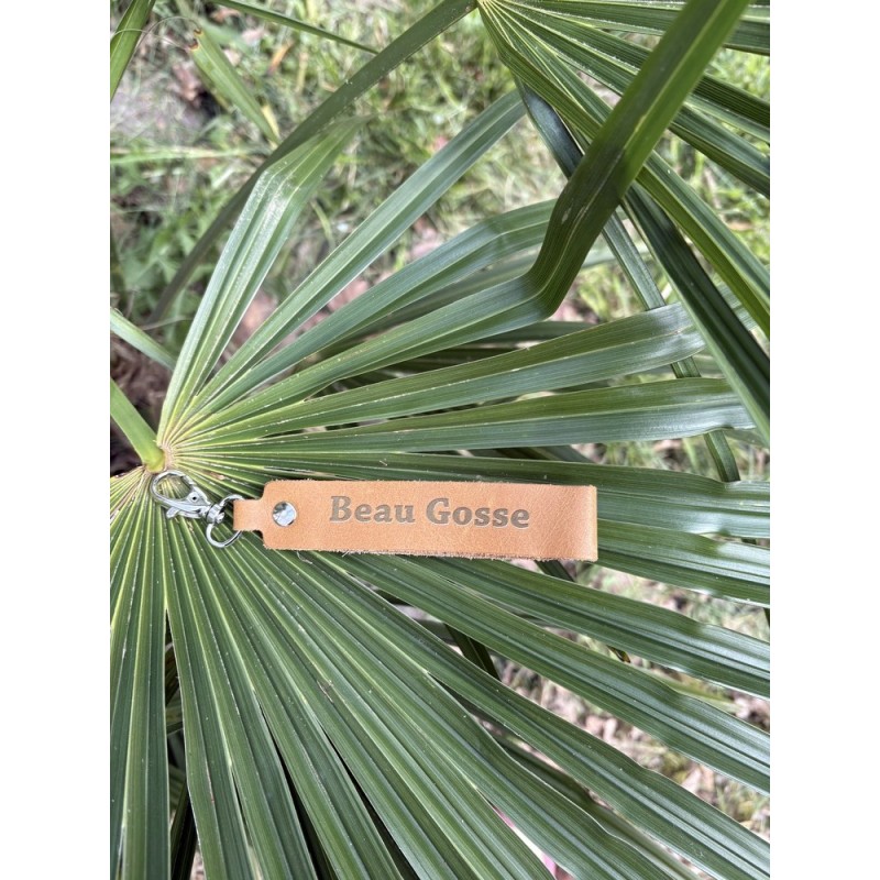 Porte-Clés en cuir Caramel issu de la marque LA CARTABLIERE sur lequel est imprimé Beau Gosse.