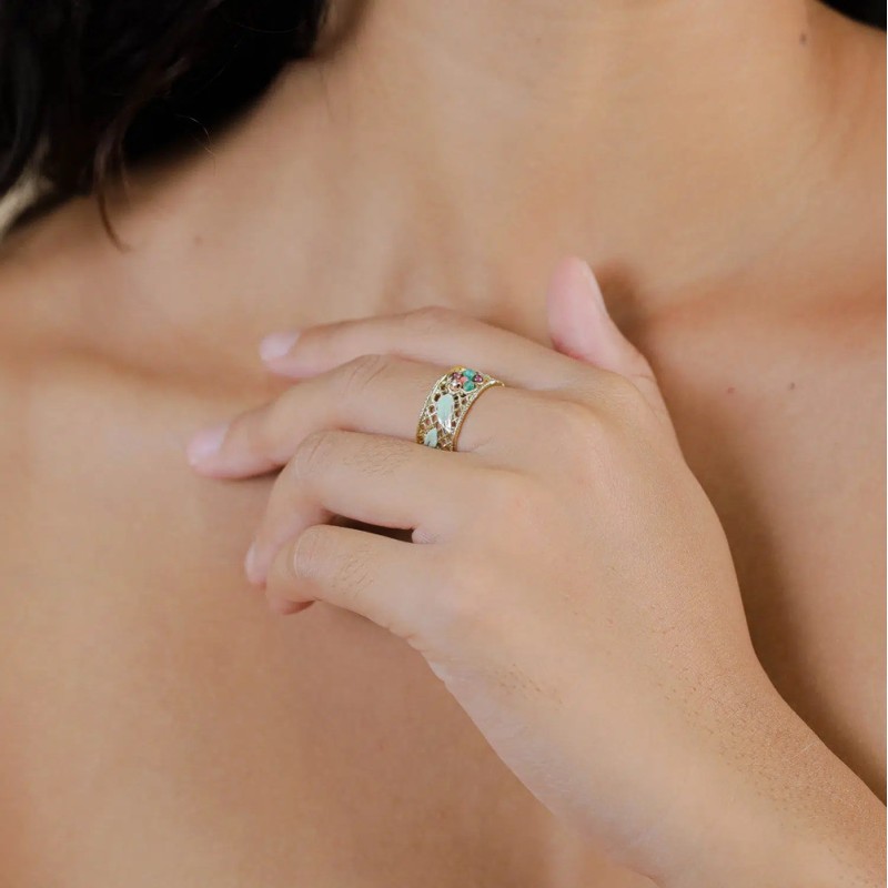 Bague Anneau Ajustable Bridget signée FRANCK HERVAL. Bridget met la broderie au centre de cette nouvelle collection. Sur un motif doré ultra-léger, la fleur en fil de coton explose en rose poudré, réveillée par des touches d’amazonite, d’aventurine et de grenat. Les boucles d’oreilles fleur brodée ce sont clairement ta signature : volume maîtrisé, mouvement cool, zéro lourdeur, c'est la paire qu’on remarque.