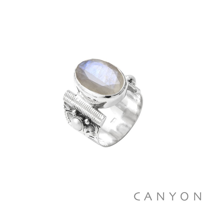 Bague en Argent signée CANYON France composée d'une Pierre de Lune ovale et de 2 perles sur un large anneau ciselé.