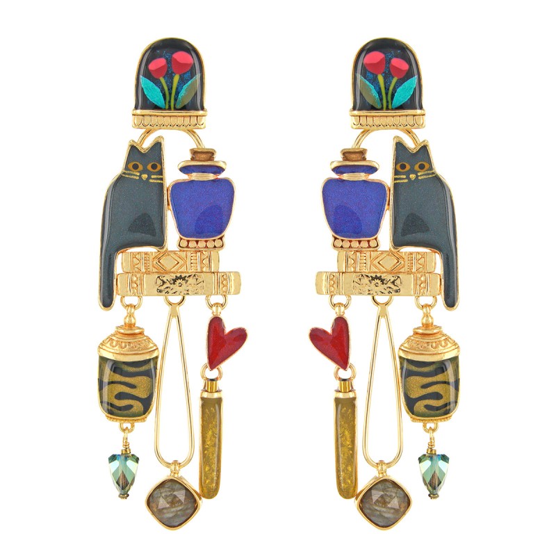 Composition : Étain, Résines colorées dont les motifs sont peints à la main, Résine transparente, Poudre de mica, Peinture dorée, Perles en verre, Fil en viscose, Labradorite, Peinture métallisée, Hématite dorée, Laiton sans nickel et traité contre les allergies.