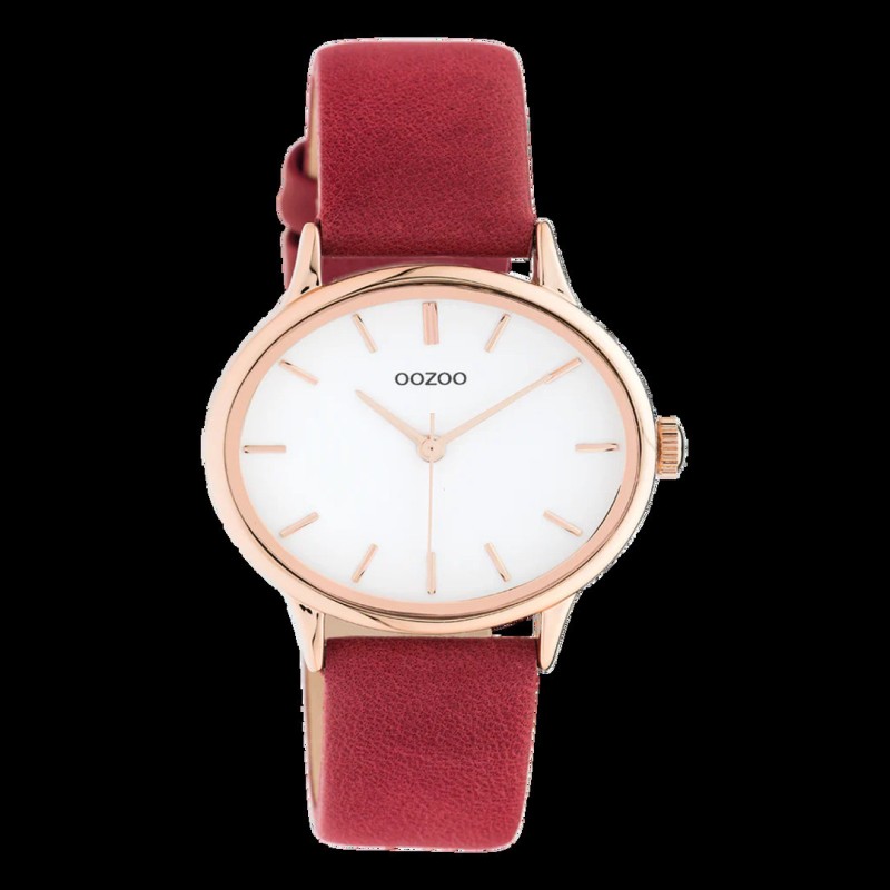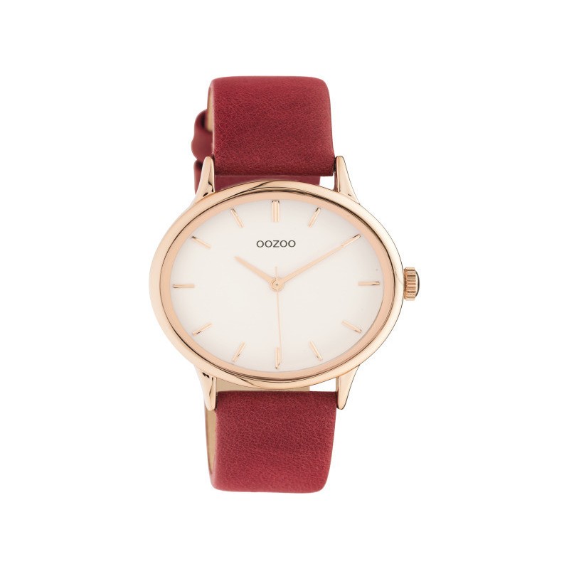 Montre femme Ovale signée OOZOO. Cette montre pour femme allie parfaitement mode et confort grâce à son boîtier en acier inoxydable doré de 35 x 42 mm et son cadran blanc soleillé. Son bracelet en cuir rouge en fait un accessoire tendance à porter au quotidien. Le cadran arbore des chiffres et des aiguilles dorés rayés. Un modèle qui apporte une touche d'éclat à votre tenue.