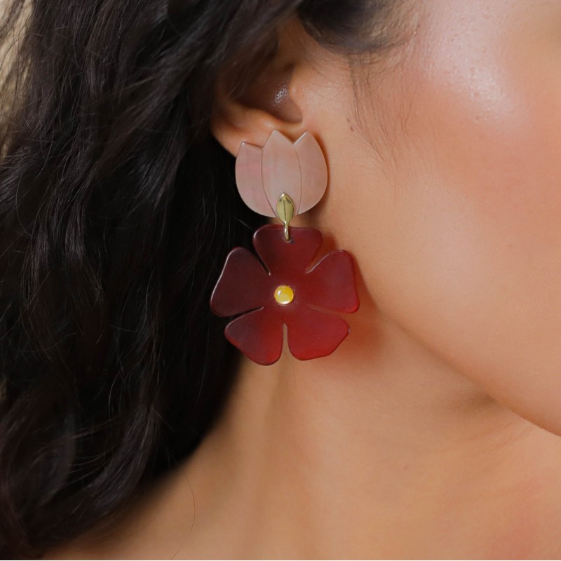 Boucles d’oreilles Clips Son Jardin signées NATURE bijoux. La collection déploie de grandes boucles d’oreilles fleur rouge ponctuées d’un cœur doré et reliées à des feuilles vertes en corne teintée. Les colliers jouent la simplicité juste : un pendentif fleur sur chaîne fine en laiton doré, ou une composition plus présente mêlant nacre brune, pétale rouge et feuille verte. Les bracelets reprennent les mêmes accords en format plus court, faciles à associer. Entièrement façonnées à la main, ces pièces Nature Bijoux célèbrent des matières naturelles travaillées avec précision pour un style fleuri et très moderne.